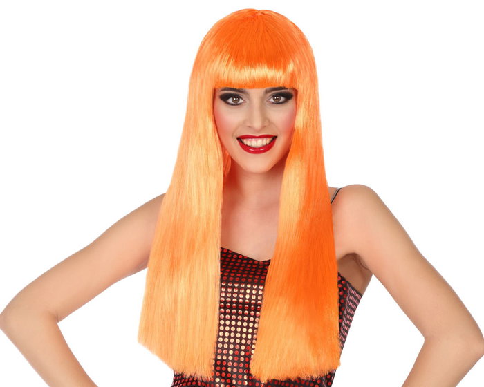 Peluca Larga Lisa Orange à Frange de 60 cm, 120 gr - Perruque longue et fluide pour déguisement Halloween, carnaval et personnage coloré