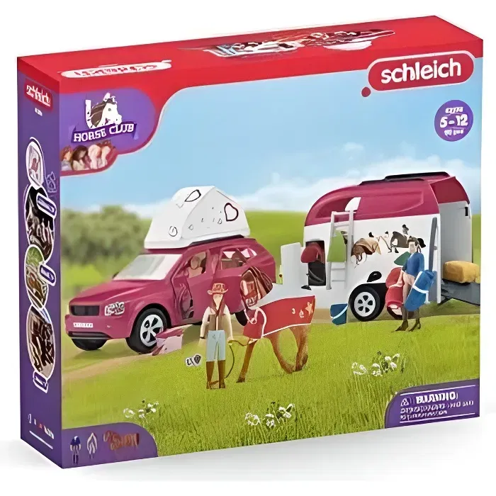 Schleich 42535 Horse Club - Coffret figurines voyage en voiture avec remorque pour chevaux, jouet pour enfants de 5 ans et plus