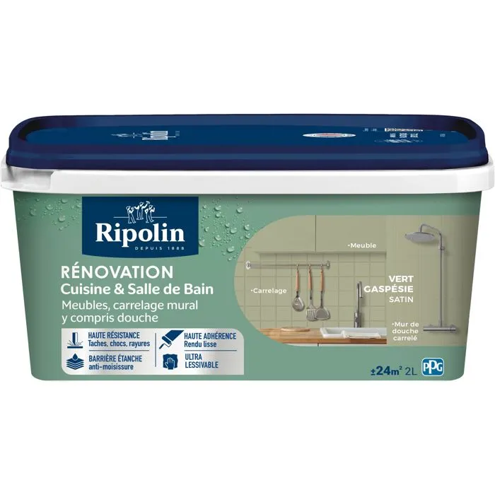 Ripolin - Peinture rénovation cuisine et salle de bain 2L - Vert gaspésie - Finition satinée - Haute résistance aux taches et lessivable