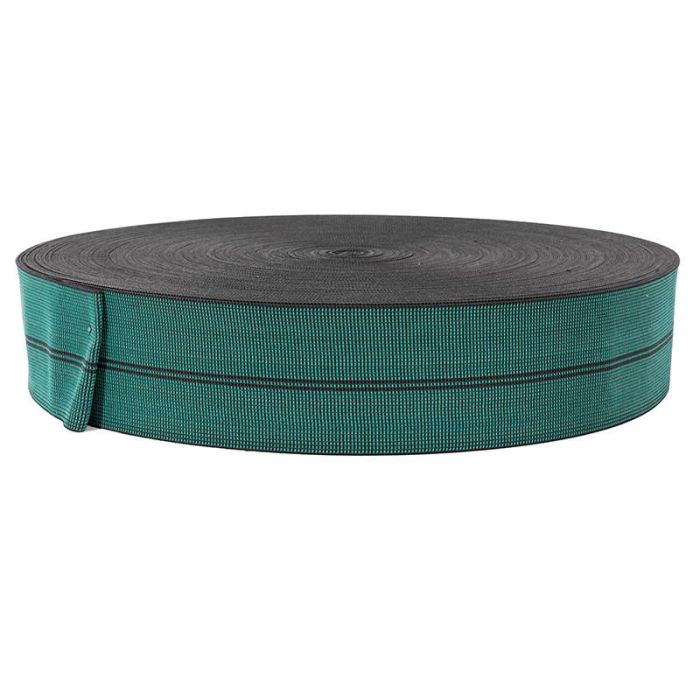 Rollo de cincha elástica verde de 100 metros de largo. El ancho de la cincha es de 60 mm, el material es goma y la elasticidad del 40%.