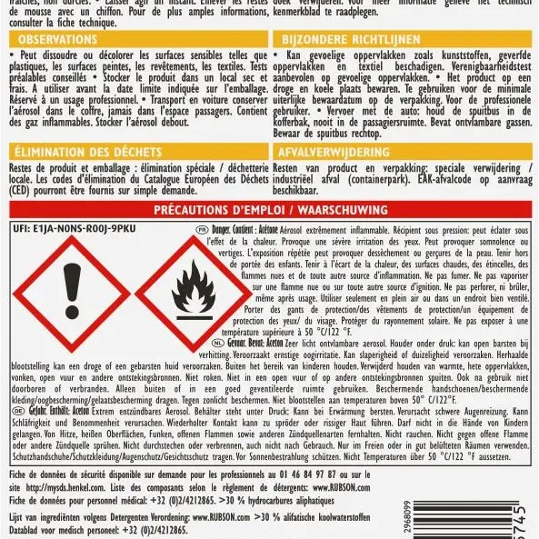 Rubson CL12 est le nettoyant indispensable pour éliminer instantanément toutes traces de mousse expansive non durcie et assurer l'entretien parfait de vos pistolets et aérosols. a base d'acétone, il détache, dégraisse et assure une maintenance optimale pour éviter le blocage prématuré du matériel. Facile a utiliser, polyvalent et indispensable pour garantir la réutilisation correcte des mousses expansives, il nettoie efficacement surfaces, valves et embouts. Attention toutefois aux matériaux sensibles : son pouvoir dissolvant exige prudence sur plastiques, peintures ou textiles. Le geste pro pour un matériel toujours opérationnel.