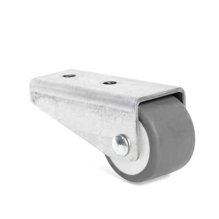 Esta rueda fija sirve para muebles ligeros, como expositores, carros de servicio, vitrinas o estructuras móviles con poco espacio bajo la base.