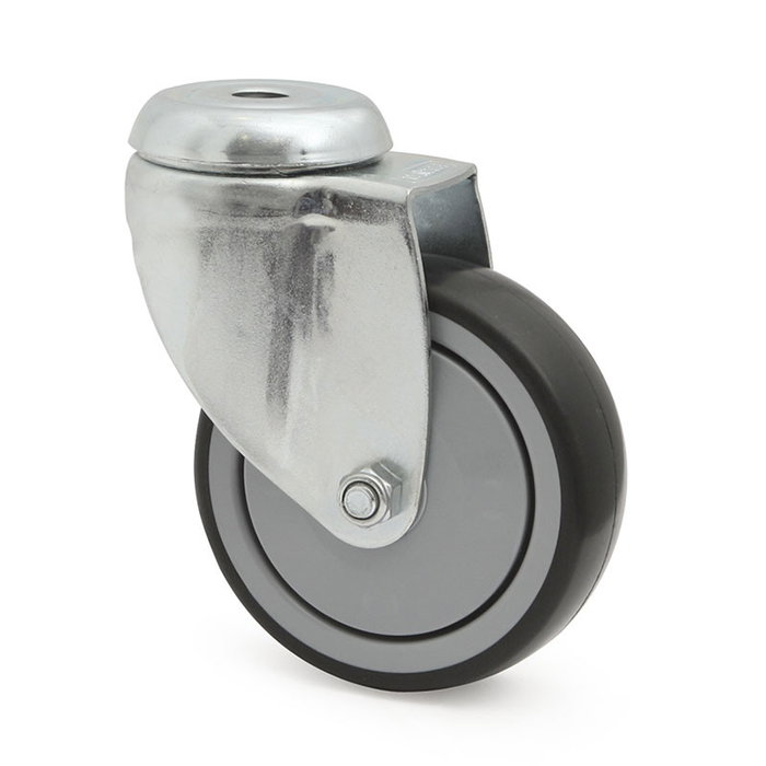 Roulette industrielle NAVARRA TP avec roues pivotantes, référence 2470. Cette roulette est équipée d'un trou traversant de diamètre 11 mm, sans système de freinage.