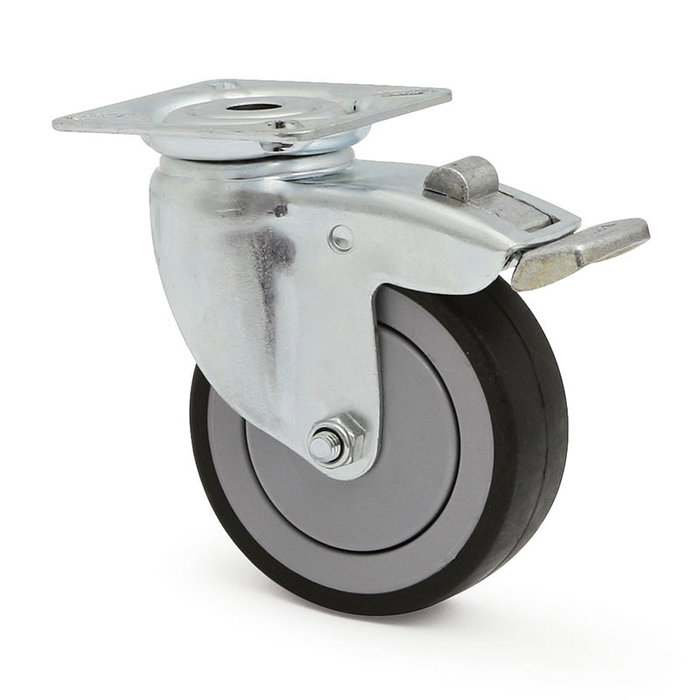 Roues pivotantes avec frein et plaque de montage, conçues pour un usage intensif en milieu professionnel. La bande de roulement en caoutchouc thermoplastique offre une résistance exceptionnelle à l'usure et aux traces, tout en assurant un roulement silencieux et fluide.