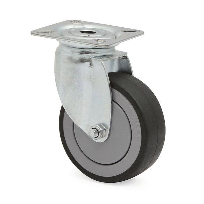 Roulettes pivotantes NAVARA PL 2470 avec plaque de fixation, sans frein. Équipées d'une bande en caoutchouc thermoplastique de haute performance, antimarquage. Convient pour les chariots de cuisine et de nettoyage, les chariots de serveurs, le mobilier de restauration, les équipements pour établissements de santé et pour personnes âgées, les chariots de supermarché, les présentoirs, les étagères et diverses applications industrielles.