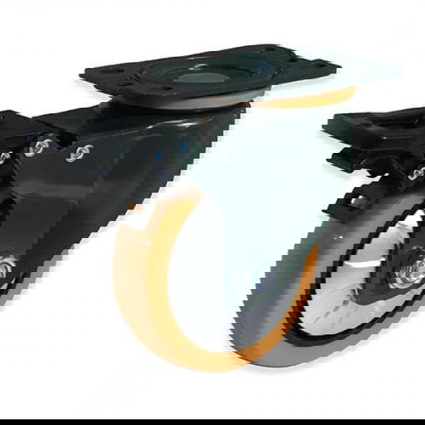 Roue pivotante avec plaque en PU 100 mm et frein de la marque GAYNER. C'est une solution robuste et polyvalente pour la mobilité de vos meubles. Fabriquée avec une roue en polyuréthane de couleur orange et une partie métallique noire, cette roue pivotante est idéale pour tout type de mobilier nécessitant à la fois mobilité et résistance.