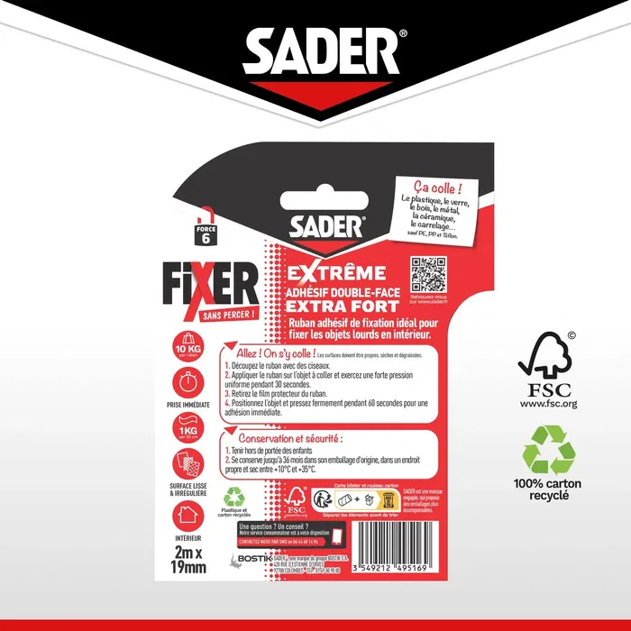 - Plus produit: 1/Adhérence Extra Forte : prise immédiate et peut supporter jusqu'à 10 kg par ruban (soit 1 kg par 20 cm), idéal pour fixer des objets lourds en intérieur. 2/Polyvalence : adhère sur la plupart des surfaces lisses et irrégulières, y compris le plastique (sauf PE, PP et Téflon), le verre, le bois, le métal, la céramique et le carrelage. 3/Durabilité : Résistant aux UV et à l'eau, ce ruban peut être utilisé dans des conditions variées, avec une plage de température allant de -10°C à +75°C.