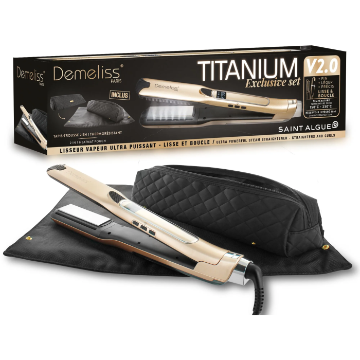 SAINT ALGUE Lisseur Vapeur Titanium Plaques Flottantes Aluminium Gold Démêlisse Demeliss Exclusive Set Tita V2 avec Tapis et Trousse de Transport