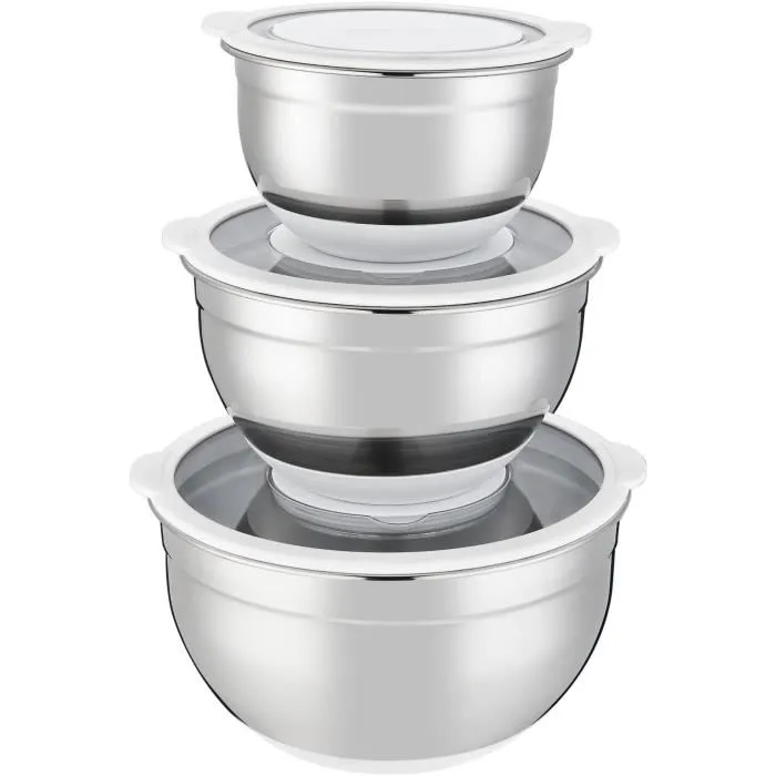 Ensemble de 3 saladiers en acier inoxydable avec fond en silicone antidérapant, graduation intérieure, couvercle avec hublot et ouverture d'acces. Idéal pour une utilisation quotidienne. Compatibles lave-vaisselle.