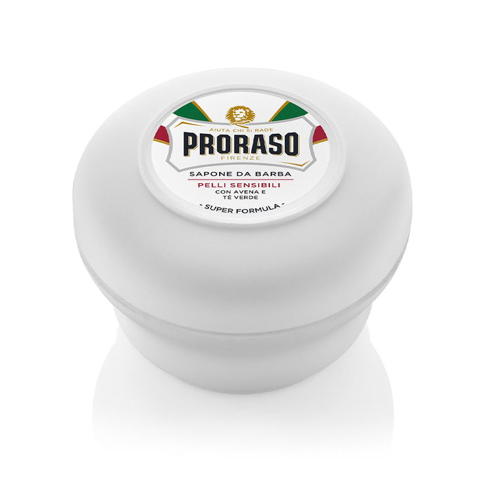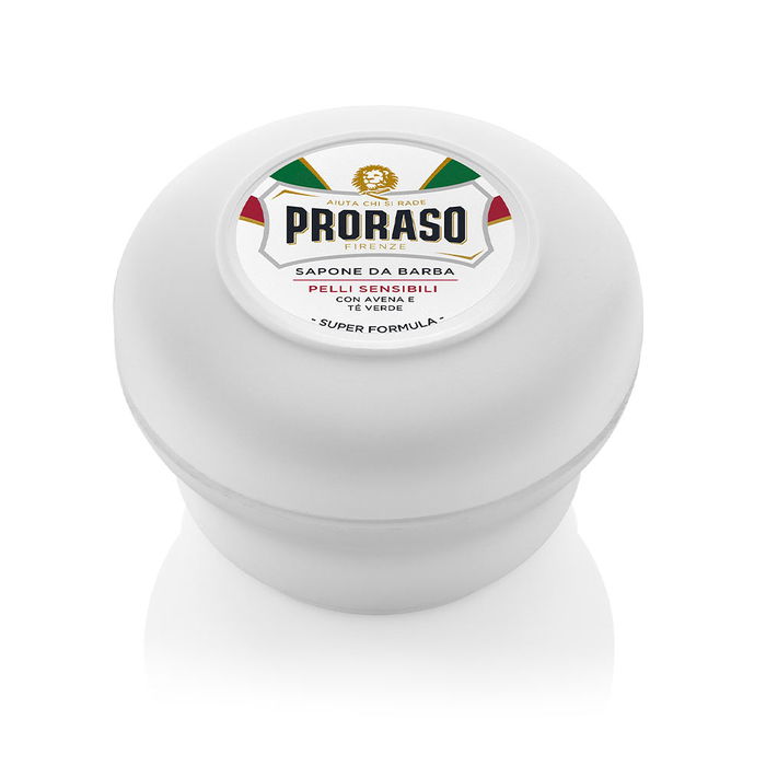 Savon à raser PRORASO en teinte blanche. Ce produit se distingue par sa texture riche, onctueuse et épaisse, offrant ainsi un rasage minutieux et en profondeur, tout en préservant la douceur et l'hydratation de la peau.
