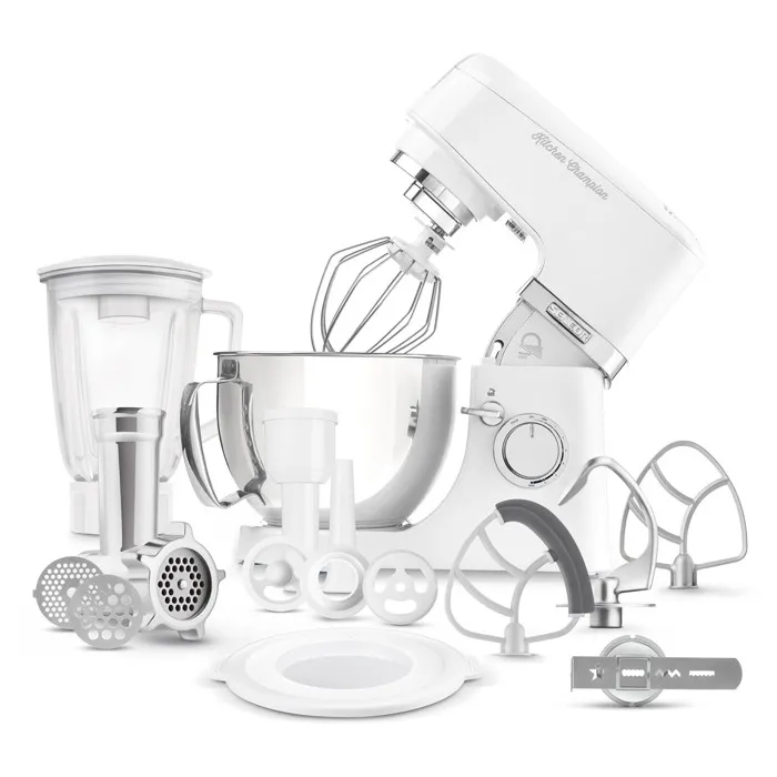 - Accessoires adaptables: Crochet de pétrissage, Accessoire batteur, bol mixeur, disque épais pour hachoir, disque fin pour hachoir, disque moyen pour hachoir, accessoire pour hachoir à viande, support pour insert, insert à cookies, poussoir à saucisses, batteur A