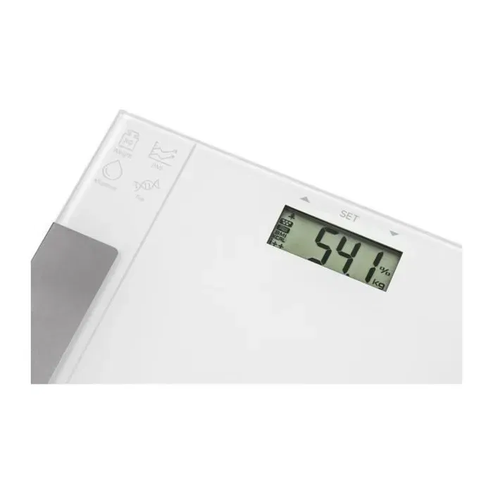 - Description du produit: Design ultra fin (20 mm) Surface en verre pour un nettoyage facile Verre de sécurité trempé (6 mm) Écran LCD extra large (74 x 28,5 mm) Fonction IMC Fonction BMR Mémoire pour 12 utilisateurs Poids jusqu'à 150 kg (sensibilité 100 g) Mesure du corps par principe BIA : % de graisse, % d'hydratation corporelle Calcul des calories nécessaires par jour pour référence Gros boutons à pression sur le dessus de la balance Fonction de mise en marche automatique (pesée immédiate lorsque l'on marche dessus) Option de sélection des unités de mesure (kg/lb) Indicateur de batterie faible et de surcharge Arrêt automatique en cas d'inactivité Fonction de verrouillage des données pour une mesure plus précise (le poids mesuré reste affiché pendant 10 secondes) Source d'alimentation : 1 pile au lithium CR2032 (incluse)