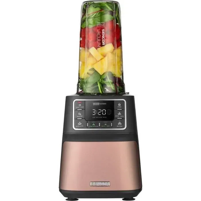 - Description du produit: Mélangeur automatique sous vide Super Blender Le mélange et le stockage sous vide conservent le maximum de nutriments, le goût frais et inhibent la croissance des micro-organismes et la formation de toxines Détecte automatiquement les accessoires montés Mélange multicyclonique avec 8 lames Titan pour des résultats optimaux Transformez les fruits entiers, les noix, les légumes, les graines et autres superaliments en une puissance liquide suprême pour votre corps Nutri Smoothie peut favoriser l'amélioration du sommeil, de la digestion et de la récupération après le sport Nutri Smoothie aide à recharger l'énergie de votre corps tout au long de la journée Extrayez les nutriments difficilement accessibles cachés dans les graines, les céréales, les noix, en décomposant les fruits et légumes entiers Technologie de mélange intelligente Sencor® Nutri pour des résultats parfaits Programmes de mélange prédéfinis PULSE pour un mélange instantané et un broyage de glace Crème glacée 7 programmes pour des résultats de mélange parfaits (SMOOTHIE, NUTRI BLEND, SMOOTHIE EXTRA, SOUPE SAUTE, ICE CRASH, FARINE ET NOIX, PULSE/EXTRA) Mécanisme de sécurité permettant de démarrer uniquement en Pieds antidérapants pour une sécurité accrue Lavable au lave-vaisselle Pièces amovibles Matériau Tritan (PCTG) pour une durabilité accrue Huit lames en acier inoxydable de haute qualité avec revêtement en titane Empêche la perte d'enzymes et de vitamines Réduit l'oxydation des smoothies nutritifs Contenu de l'emballage : Pichet mixeur TRITAN (PCTG) de 1,5 L, bouteille de stockage de 0,7 L, unité sous vide Longueur du cordon d'alimentation : 1,1 m 28 000 tr/min Puissance d'entrée : 1 500 W