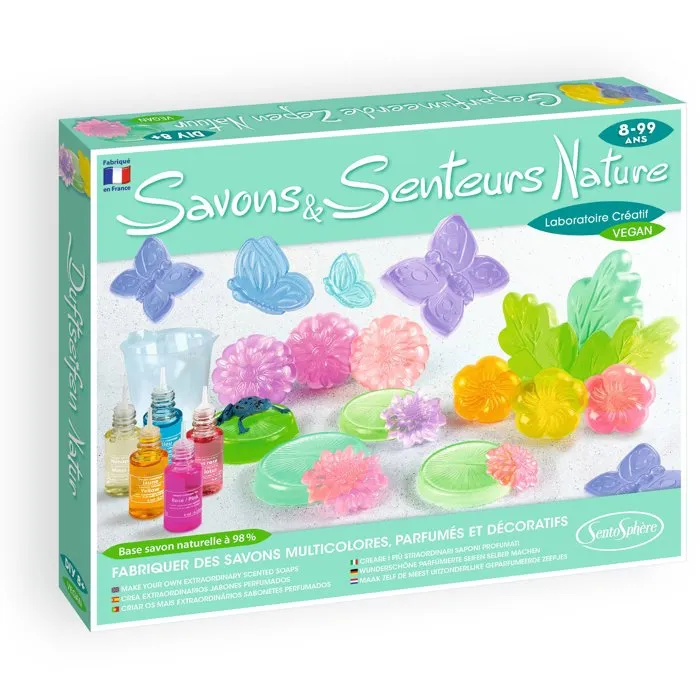 - Description du produit: Un coffret DIY pour faire de beaux savons multicolores sur le thème de la nature : nénuphars, lotus, papillons ou grenouilles. Très facile d’utilisation car tous les accessoires ont été pensés pour faciliter la création. La base glycérinée fond au bain-marie ou au micro-ondes, se parfume et se colore suivant une palette de couleurs acidulées suggérées dans le mode d'emploi. Des recharges permettent d’utiliser longtemps ce coffret dans une logique d'éco-conception. Des savons très doux, parfaits pour un usage quotidien ou faire des petits cadeaux.