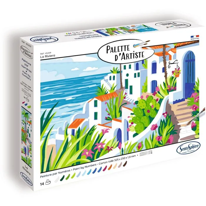 Sentosphere - La Riviera - Peinture par numéros pour adultes - Palette d'artiste avec peintures acryliques à 50% bio - Tableau en carte toilée - 21 références - Style vie & évasion