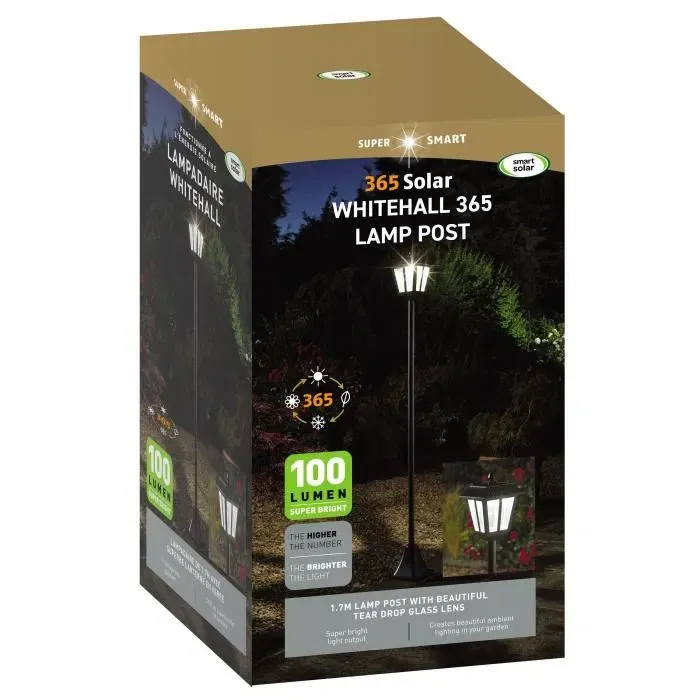 Smart Solar Lampadaire Solaire d'Extérieur Lanterne 365 - 170 cm, LED 100 lm Blanc Froid, Lentille Verre Effet Goutte, Structure Métal Noir
