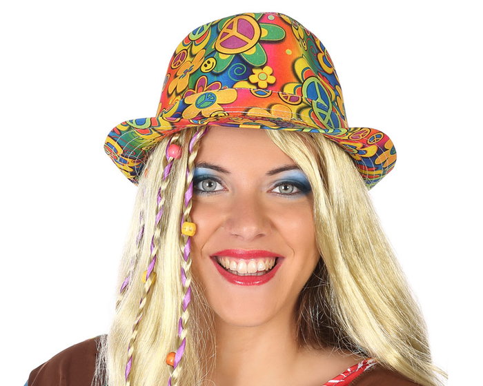 Voyagez à l'ère du flower power avec ce chapeau hippie coloré, débordant d'énergie positive. Son imprimé psychédélique, orné de fleurs, de cœurs et de symboles de paix, en fait l'accessoire idéal pour un déguisement des années 60 ou une tenue thématique pour un festival. Ajoutez une touche amusante et vibrante à votre look rétro.