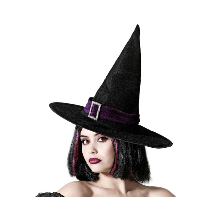 Sombrero de Bruja Negro con Cinta de Terciopelo Morado et Boucle - Accessoire de Déguisement Élégant pour Halloween et Soirées