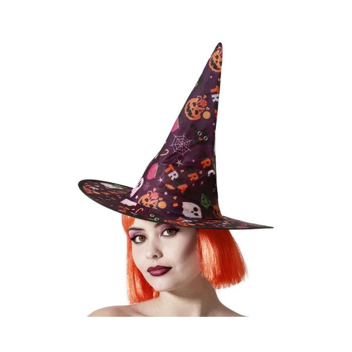 Sombrero de Sorcière Pourpre Foncé avec Imprimé Halloween Multicolore (Fantômes, Citrouilles) - Accessoire de Déguisement pour Enfants