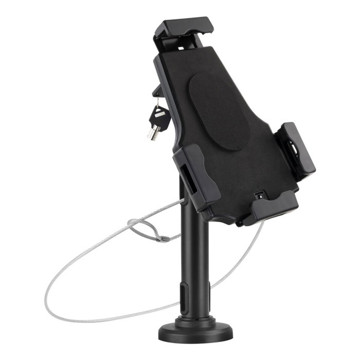 Le support pour mobiles TooQ modèle TQTDS0812 est une solution robuste et polyvalente conçue pour les commerces et espaces publics, offrant une fixation sûre et fonctionnelle pour tablettes de 7,9” à 10,5”. Fabriqué en acier de haute qualité avec une finition noire, ce support allie solidité et design discret, idéal pour les environnements exigeants. Il dispose d’un système avancé de rotation et d’inclinaison permettant un angle d’inclinaison de -70º à +70º, une rotation horizontale de -165º à +165º et une rotation d’écran de -180º à +180º, facilitant l’ajustement pour une visualisation optimale sous tous les angles. Sa base peut être fixée solidement sur une table ou un mur grâce au kit de montage inclus, comprenant visserie et un adaptateur mural, offrant flexibilité selon l’espace disponible. De plus, il intègre un système de gestion des câbles pour maintenir l’ordre, éviter les enchevêtrements et faciliter la gestion du câblage, complété par un cadenas antivol pour protéger la tablette en lieux publics. Ses dimensions réglables permettent de maintenir des tablettes d’une largeur entre 134 mm et 197 mm, avec une hauteur du support entre 196 mm et 270 mm, et une hauteur totale de 215 mm de la base au centre du support, s’adaptant ainsi à divers modèles universellement. Pesant environ 0,99 kg, ce support offre stabilité sans encombrement. Le pack comprend le support, l’adaptateur mural, un kit de montage (sans outils) et un manuel d’installation, facilitant la mise en service. En résumé, le support pour mobiles TooQ TQTDS0812 combine fonctionnalité, sécurité et adaptabilité pour l’exposition et l’usage de tablettes en milieu professionnel, garantissant durabilité et facilité d’utilisation dans toute installation.