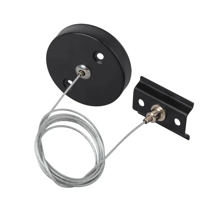 Le kit de suspension pour rail monophasé permet d'installer les rails à une certaine distance du plafond. Chaque kit est composé d'un câble en acier d'une longueur de 1 mètre, d'un crochet de rail et d'un crochet de plafond. Ces kits permettent de maintenir les systèmes de rails en suspension, à une hauteur réglable. Cela offre une grande variété d'options pour la hauteur des luminaires, permettant la création d'ambiances très originales et exclusives. Pour fixer chaque section de rail au plafond à l'aide de ce système, deux kits sont nécessaires. Il convient donc de placer un kit à proximité de chaque extrémité du rail.