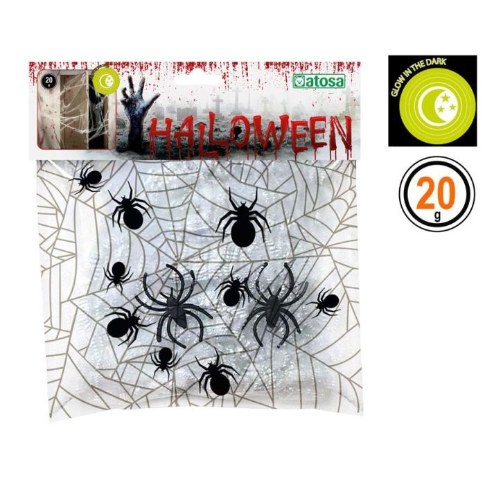 Toile d'araignée blanche brillante dans le noir 20g avec araignées noires - Décoration Halloween
