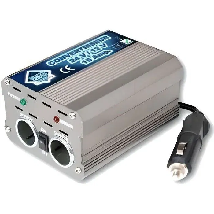 Ce convertisseur permet d'utiliser des appareils 12V sur une alimentation 24V.Sa puissance maximale est de 180W, Il possede un boîtier métal ventilé pour une meilleure dissipation thermique, le ventilateur intégré permet un refroidissement efficace. Protections surchauffe, surcharge, inversion polarité par fusible