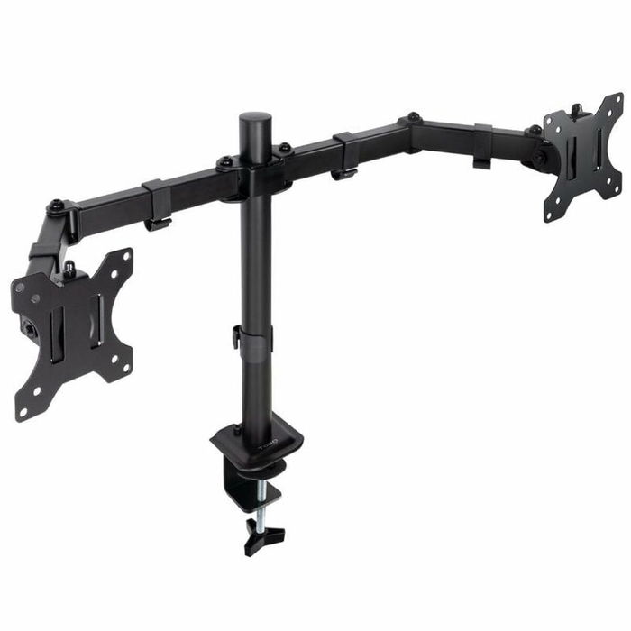 Le support de bureau pour écran DB1802TN-B de TooQ est une solution polyvalente et robuste conçue pour soutenir et ajuster des écrans de 17 à 27 pouces (43,2 à 68,6 cm) avec une capacité maximale totale de 16 kg et jusqu’à 8 kg par chacun de ses deux bras articulés, permettant ainsi l’installation simultanée de deux moniteurs. Ce support est compatible avec les interfaces de montage VESA standard 75 x 75 mm et 100 x 100 mm, adapté à la plupart des écrans et téléviseurs de petite et moyenne taille. Son design en noir intègre plusieurs réglages manuels pour une personnalisation ergonomique : il offre une hauteur ajustable jusqu’à 413 mm et une profondeur variable jusqu’à 417 mm, avec un angle d’inclinaison réglable entre -45° et 45° et une rotation complète de 180° (de -90° à 90°), permettant d’orienter l’écran en mode paysage ou portrait. De plus, il dispose d’une fonction pivotante et rotative pour adapter la visualisation selon les besoins de l’utilisateur. Le support permet un montage fiable par colliers ou vissage, assurant une fixation sécurisée sur des bureaux jusqu’à 5 cm d’épaisseur. Sa conception intègre également un système de gestion de câbles pour maintenir l’espace organisé et dégagé. Avec des dimensions totales de 826 mm de largeur et 413 mm de hauteur et un poids net de 2,8 kg, cet accessoire est livré avec kit de montage et manuel d’utilisation, facilitant son installation. Son design articulé et ajustable favorise une utilisation ergonomique et optimise l’espace dans les environnements professionnels ou de loisirs, améliorant la visibilité et réduisant la fatigue visuelle. L’ensemble des caractéristiques techniques et fonctionnelles du support DB1802TN-B de TooQ en fait un outil pratique et flexible pour les utilisateurs souhaitant accroître leur productivité ou mieux organiser leurs postes à double écran.