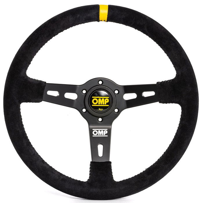 Le dernier modèle de volant de rallye OMP. Conçu pour le sport automobile. Bras en aluminium. La prise en daim épais offre une très bonne adhérence. Il a une bande jaune et des fils noirs.